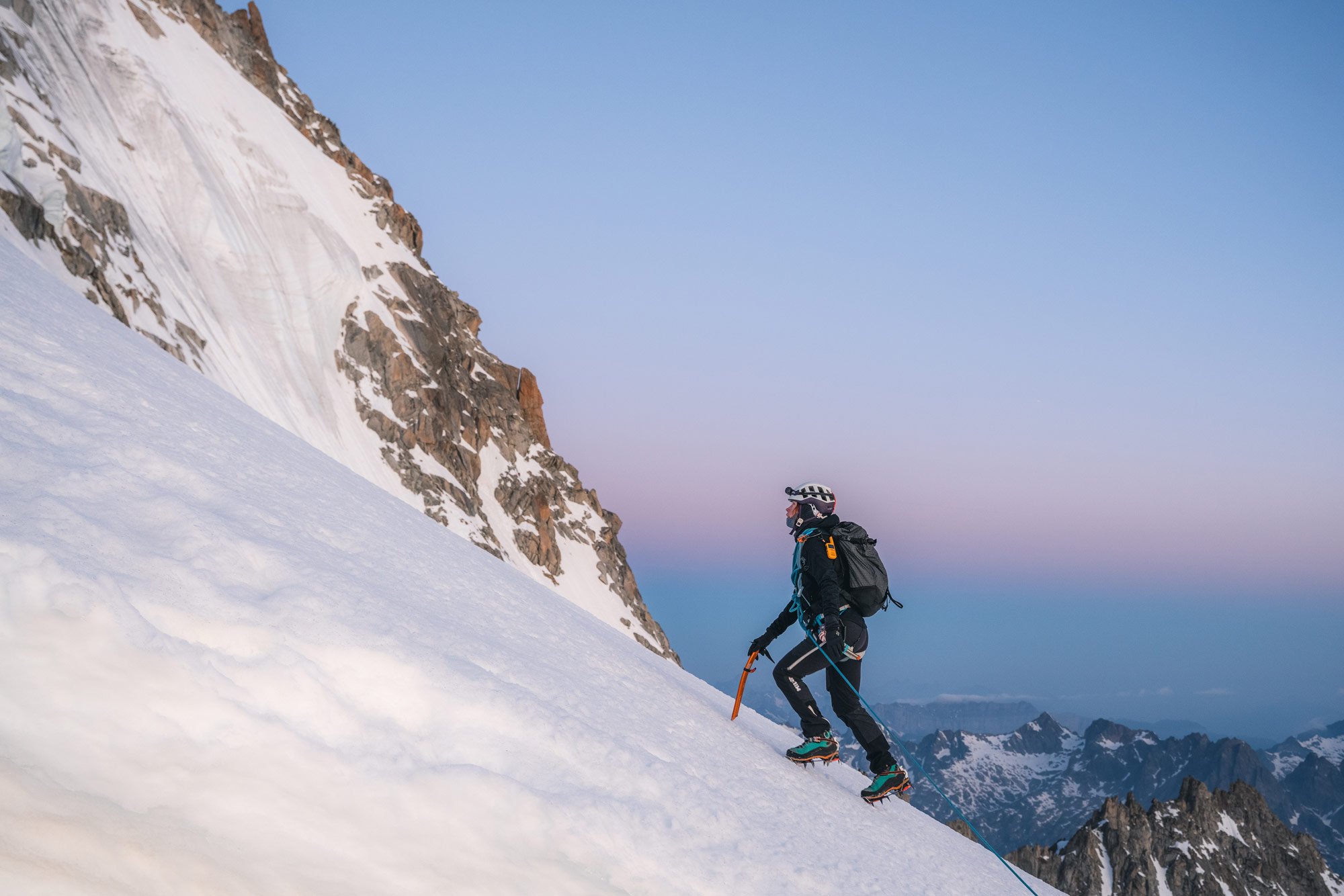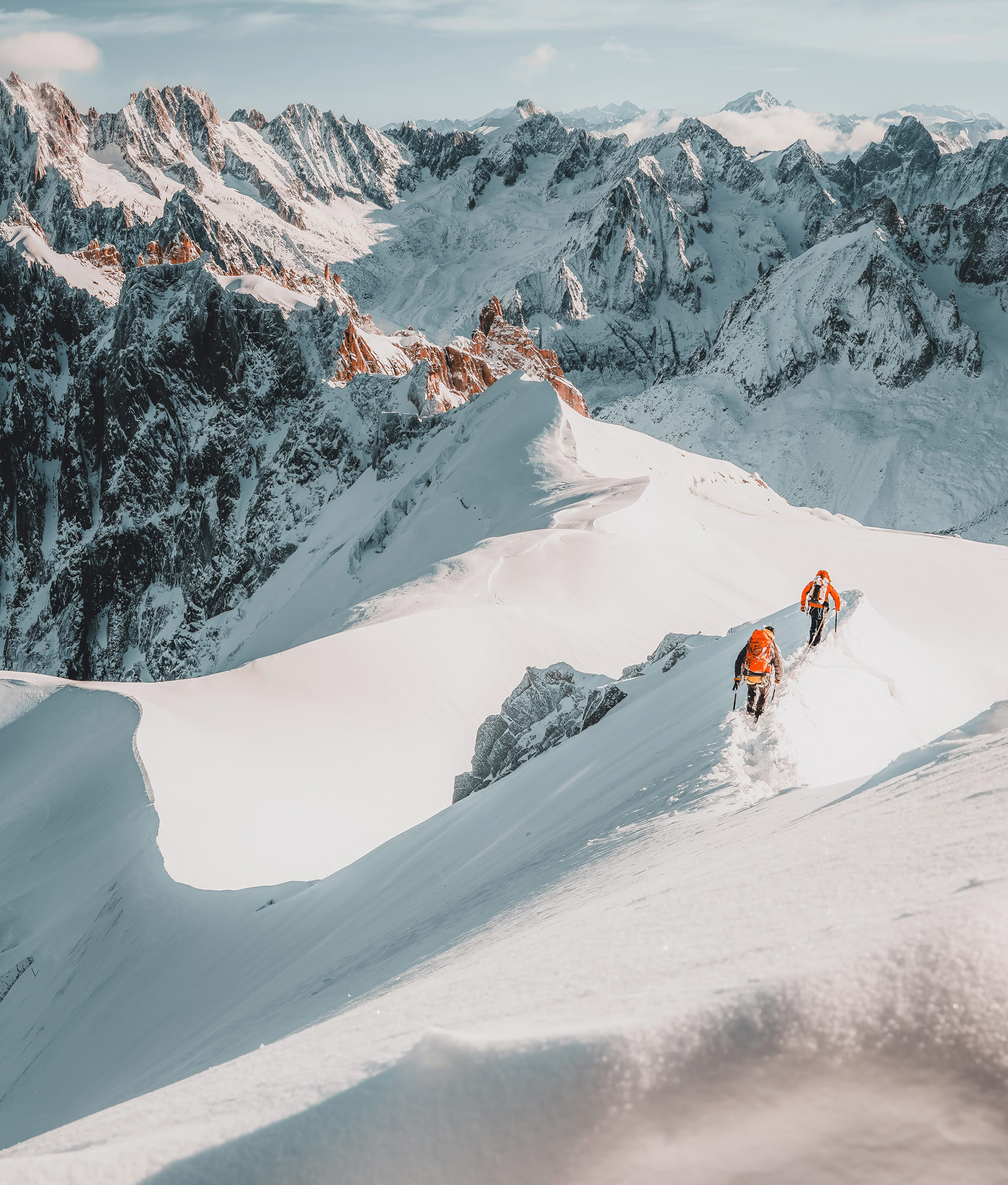 Two mountaineers descending the Aiguille du Midi Arête in the Mont Blanc Massive.